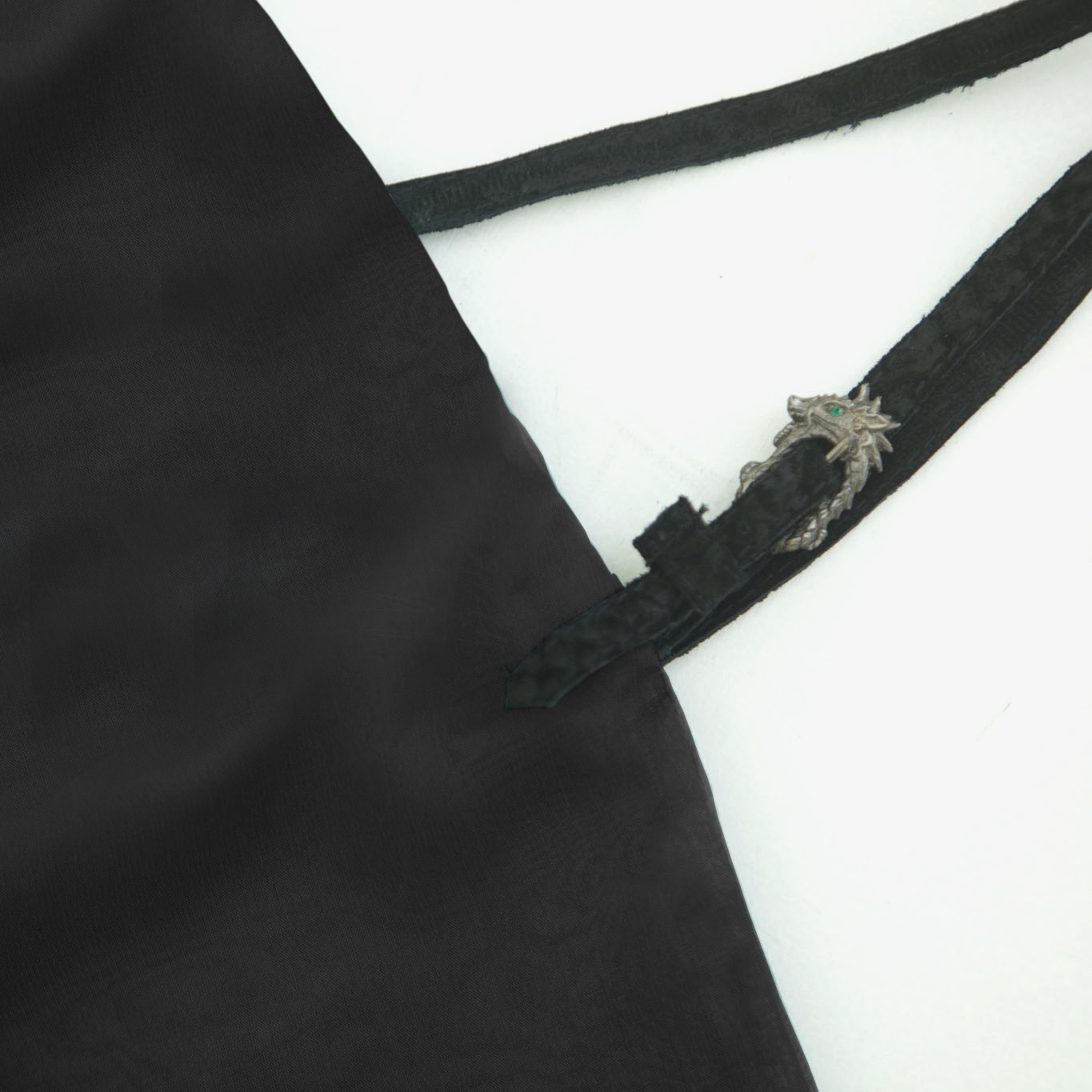 MATERIAL: 100% SILK/LEATHERN BACK STRAPS/HORN DETAIL CENTERPIECE/ CLOSURE BRASS CARVED DRAGON WITH SWAROVSKI GREEN EYE