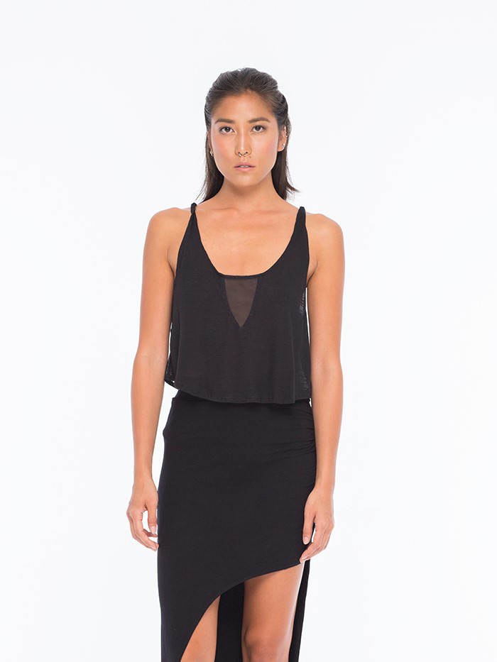 This top has a mesh fabric V insert in the front and on the sides. It ties behind the shoulders.