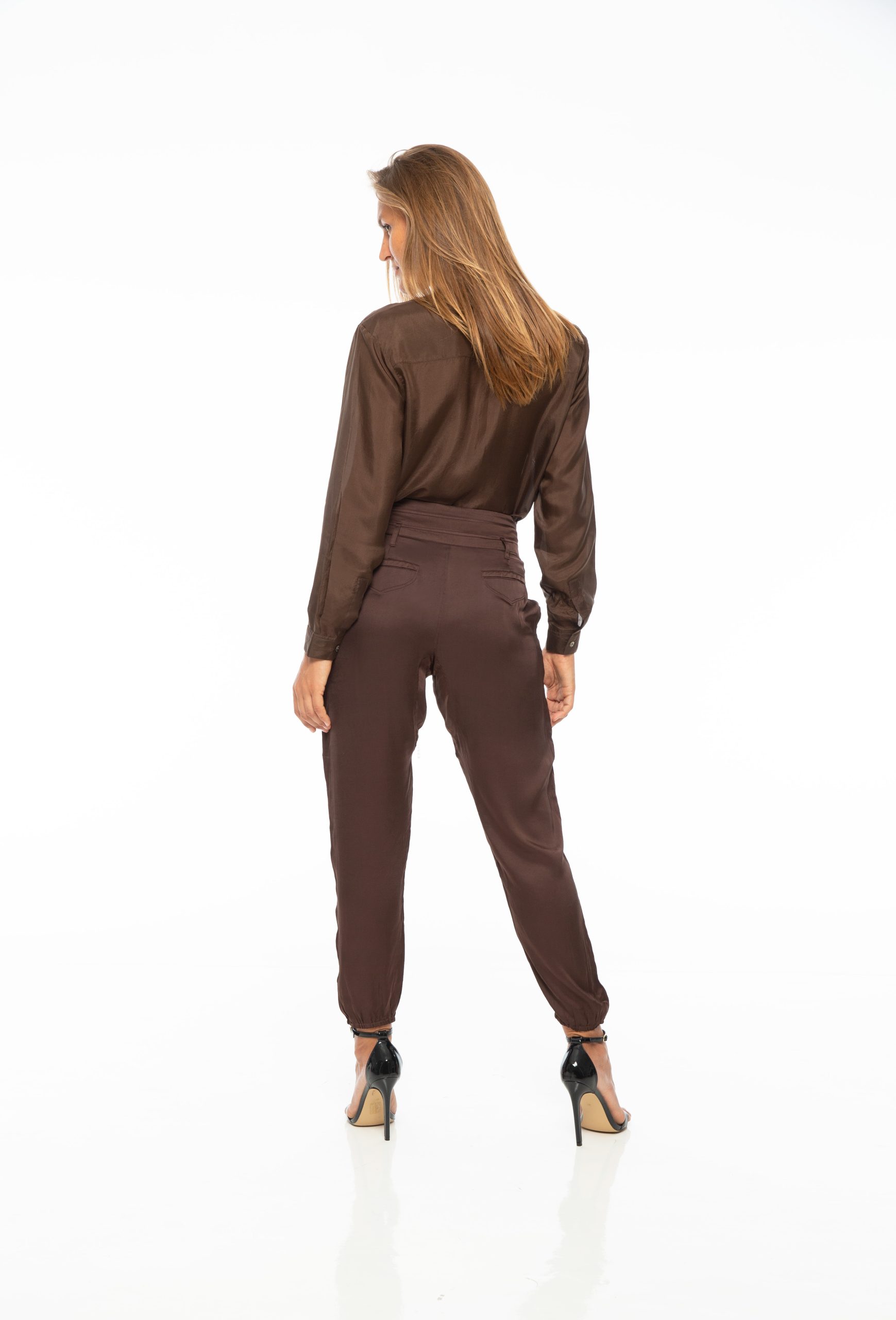 High-waisted baggy trousers in brown color made of silk with elastane. Designed to complement the silhouette with a soft, fluid drape. This silk trousers are cut to gently follow the body while maintaining a fluid, relaxed shape, they offer a soft drape and subtle stretch for ease of movement. Finished with a concealed side zipper for a sleek fit.